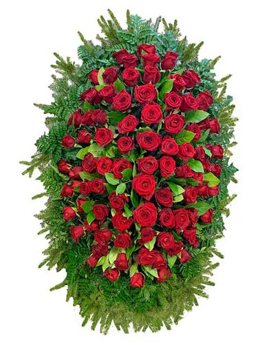 В центре траурного венка расположилось красное сердце, выложенное из роз. Этот универсальный символ любви способен без слов выразить самые теплые чувства к покойному. Фон композиции составлен из белоснежных бутонов роз и зеленой листвы. Декоративная лента дополняет композицию.